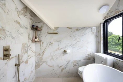 The bathroom was fitted with a spacious shower and a marbled tile finish that not only created a stunning aesthetic and made these owners lives much easier, but the entirety of this greatly successful Rear Mansard loft conversion added significant value to the property.